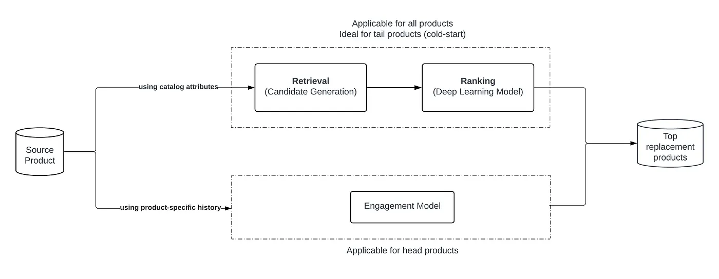 Head vs Tail Problem: Popular products, often receiving substantial customer engagement, are easier to rank due to abundant data. However, we primarily depend on catalog attributes to recommend effective replacements for less frequently purchased (tail) items or newly introduced products (cold start). This approach might only sometimes result in high customer approval. Ensuring a balance between these extremes is crucial for customer satisfaction.