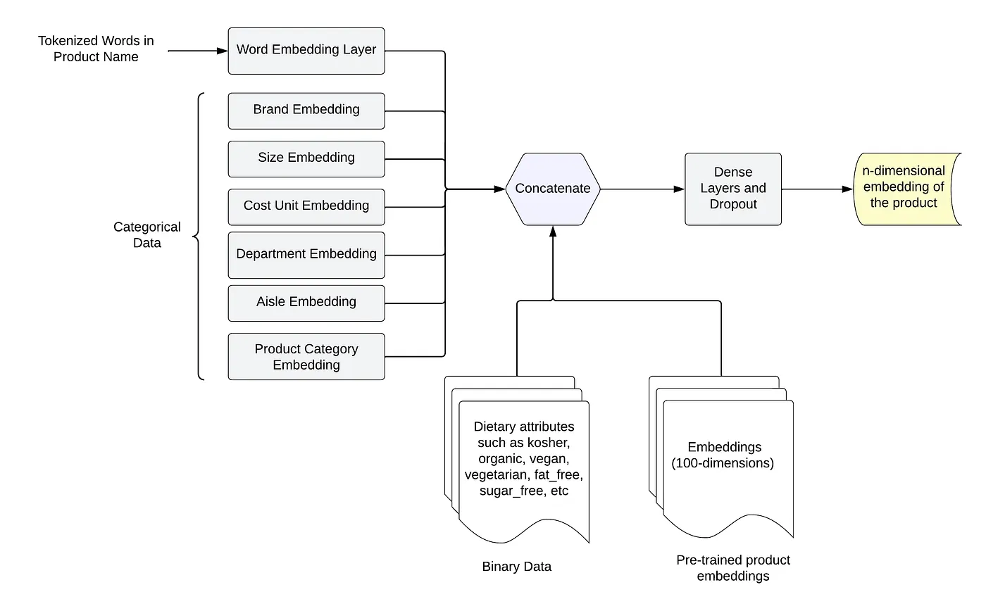 We’ve devised a supervised deep-learning model that optimizes for customer approvals — that is, to maximize the likelihood that customers will accept a candidate product as a suitable replacement should the source product be out of stock. The model considers the different product attributes from our catalog and is trained on customer impressions on Instacart. We favored a pointwise approach for its simplicity in integrating the pointwise ranking score with other relevant business logic. Employing our trained model, we refresh the scoring pipeline weekly to fetch and score new replacement candidates using automated data pipelines. This practice ensures maximum coverage and mitigates the cold start problem for any newly introduced products and retailers at Instacart.
