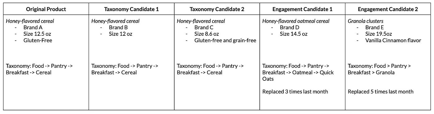 As depicted in Figure 8, the top recommendations for the same original product from the engagement model (employing engagement data) substantially differ from those suggested by the deep learning model (using catalog data and product embeddings). We observe that a few cereals are top choices among Instacart customers as substitutes for the Honey flavored cereal (Brand A, 12.5 oz, Gluten Free).