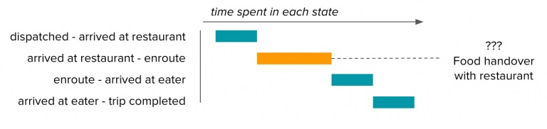 In Uber’s ride-hailing business, a driver picks up a user from a curbside or other location, and then drops them off at their destination, completing a trip. Uber Eats, our food delivery service, faces a more complex trip model. When a user requests a food order in the app, the specified restaurant begins preparing the order. When that order is ready, we dispatch a delivery-partner to pick it up and bring it to the eater.