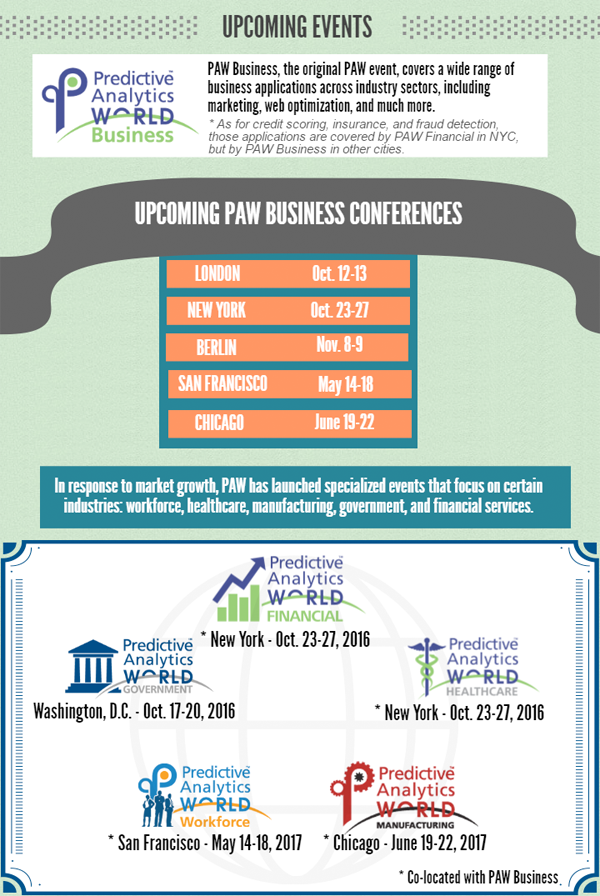 Join us this fall for PAW Business, PAW Financial, PAW Healthcare, eMetrics Summit, and/or the Predictive Analytics Times Executive Breakfast. All are co-located at the Jacob Javits Conference Center in New York City during October 23 – 27, 2016. Use code PATIMES16 for an extra 15% off current prices.