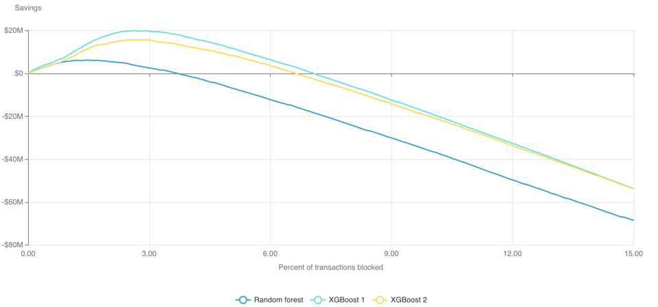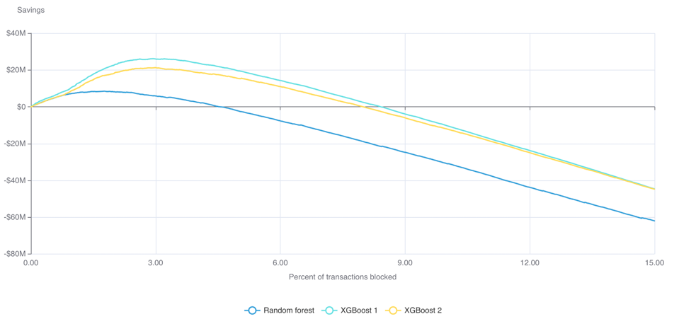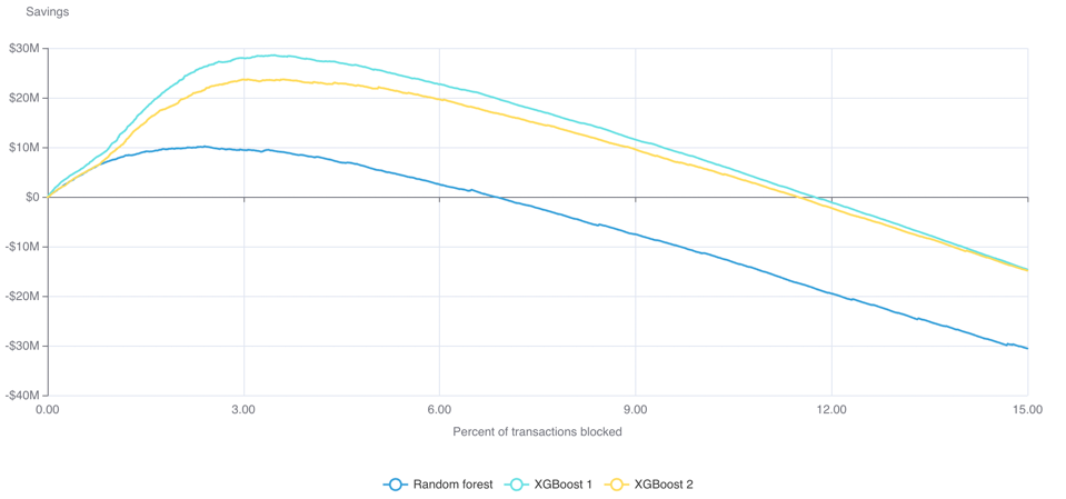 The three colors represent three competing ML models: two variations of XGBoost and one random forest (these are popular ML methods). The first XGBoost model is the best one overall. The savings are calculated over a real collection of e-commerce transactions. So was the previous example’s calculations.
