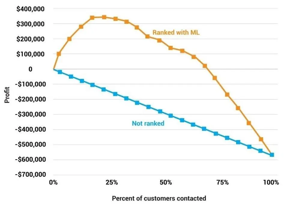 A profit curve for targeting marketing with a machine learning model. As more customers are contacted, the profit goes up and then back down.